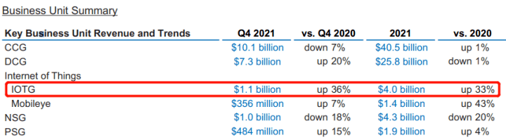 在晶圓代工巨頭臺(tái)積電公布的財(cái)報(bào)中,2021年其手機(jī)業(yè)務(wù)營(yíng)收首次被HPC(大型高性能計(jì)算)業(yè)務(wù)超越,面向汽車板塊的營(yíng)收和訂單需求也猛增。 圖像傳感器芯片設(shè)計(jì)龍頭韋爾股份最新財(cái)報(bào)顯示,其半導(dǎo)體業(yè)務(wù)收入同比增長(zhǎng)18%,雖然智能手機(jī)CMOS占據(jù)營(yíng)收大頭,但業(yè)績(jī)?cè)鲩L(zhǎng)主要來(lái)源于車載CIS與安防CIS,尤其在安防領(lǐng)域?qū)崿F(xiàn)高達(dá)60%的業(yè)績(jī)?cè)鲩L(zhǎng)。 2021年物聯(lián)網(wǎng)事業(yè)部(IoTG)成為國(guó)際半導(dǎo)體巨頭英特爾增長(zhǎng)最快的業(yè)務(wù),同比增長(zhǎng)33%,同時(shí)汽車自動(dòng)駕駛業(yè)務(wù)也增速驚人,反觀主營(yíng)PC終端的CCG部門業(yè)績(jī)僅增1個(gè)百分點(diǎn)。